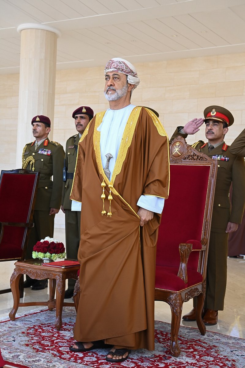 وعند اعتلاء جلالتِه المقصورة السُّلطانية أدّت طوابير العرض التحيّة العسكريّة، وعزفت الموسيقى العسكريّة المشتركة السّلام السُّلطاني، وأطلقت مدفعية سُلطان #عُمان بالجيش السُّلطاني العُماني إحدى وعشرين طلقة تحيّةً لجلالتِه /أعزّه الله/.