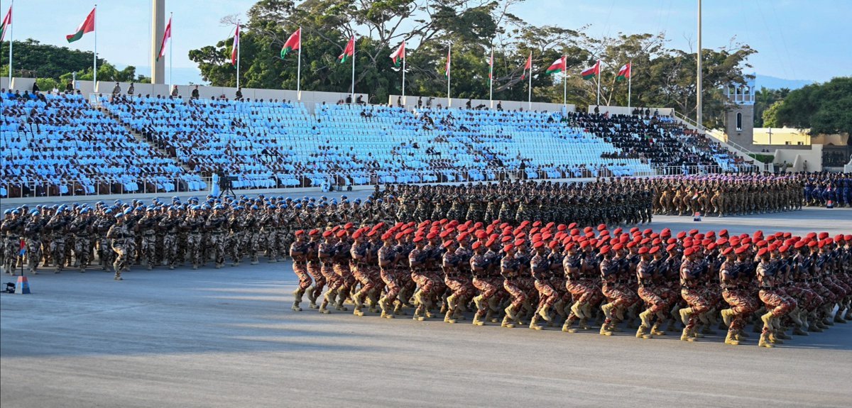 وسلاح الجو السُّلطاني العُماني، والبحرية السُّلطانية العُمانية، والحرس السُّلطاني العُماني، وقوة السُّلطان الخاصة، وشرطة عُمان السُّلطانية وفرق الموسيقى العسكرية المشتركة والراكبة وبمشاركة قوات الفرق.
