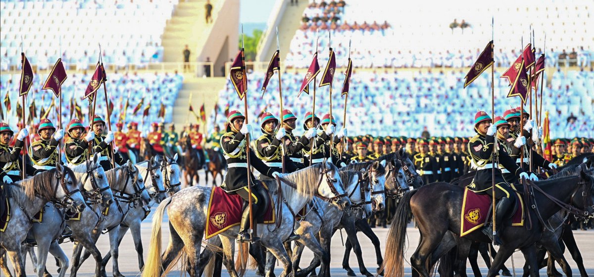 ثم قدّمت طوابير حرس المراسم استعراضها العسكري بمصاحبة المقطوعات الموسيقيّة للموسيقى العسكريّة المشتركة، مؤدية التحيّة العسكريّة لجلالةِ القائد الأعلى/حفظه الله ورعاه/.
