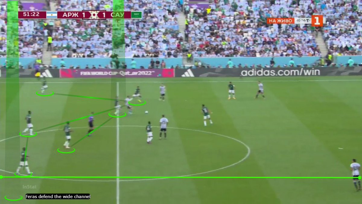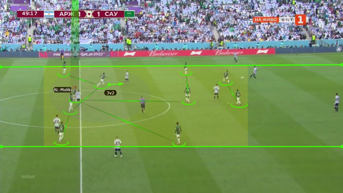 الدور المحوري الآخر كان للجناح الأيمن فراس البريكان، اللي كان بيتمركز للداخل لغلق مسار التمرير بالعمق، بالإضافة لدوره في مساعدة خط الدفاع بالعودة كمدافع خامس لحماية الممر الخارجي بحيث يظل الرباعي يدافع عن مساحة عرضية أقل.