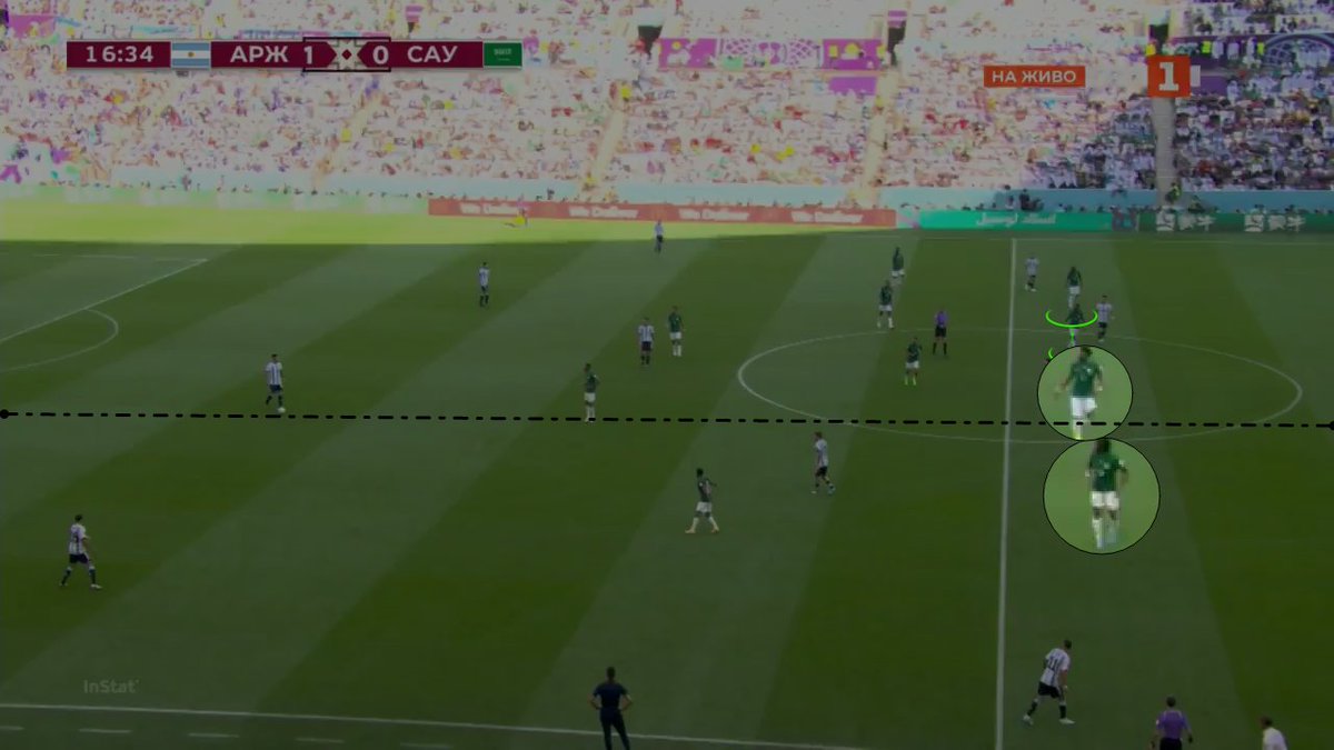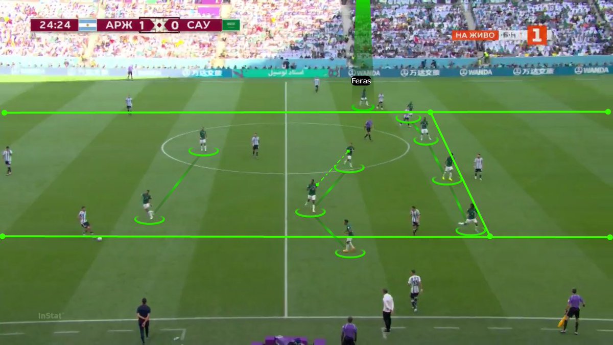 متوسط تمركز لاعبي السعودية في الشوط الأول..لاحظ تقارب الخطوط وارتفاع خط الدفاع.