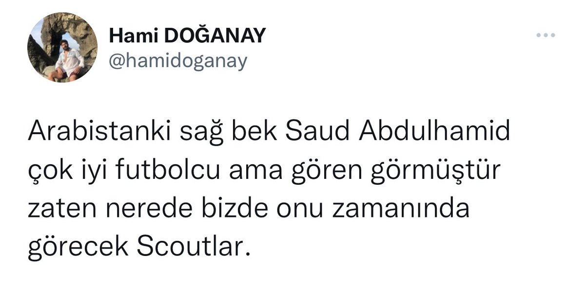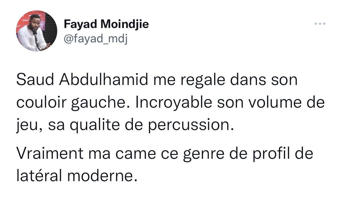 "الظهير الأيمن سعود عبدالحميد من السعودية لاعب جيد جداً. الذين رأوه بلا شك وضعوا اعينهم عليه. بانتظار الكشافين لنعرف أين سراه مع الوقت".