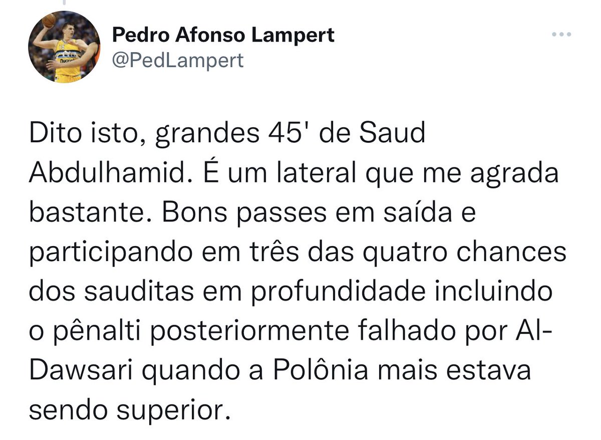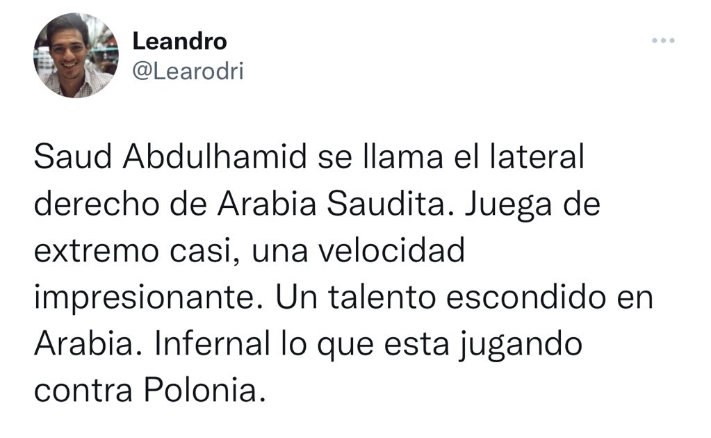 "سعود عبدالحميد الظهير الأيمن للسعوديه. لعب بشكل مذهل. سرعة خيالية. موهبة مدفونة في السعودية. ياله من أداء قدمه أمام بولندا".