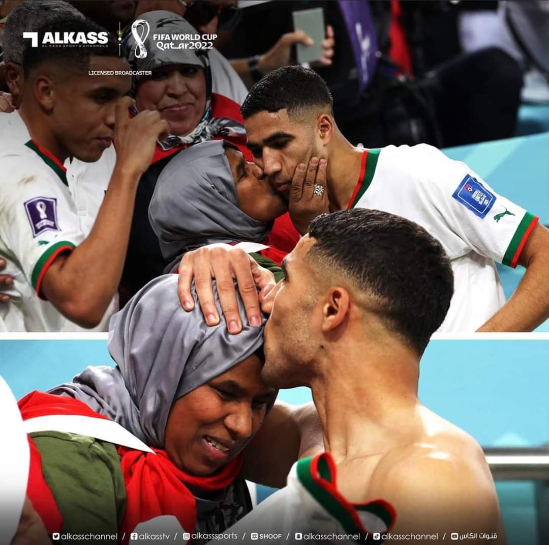 وفي مشهد مؤثر صعد نجم المنتخب "أشرف حكيمي" المدرجات وعانق أمه التي كانت تفيض دمعا وفرحا وقبل رأسها .. ضمته إلى صدرها واستدارت بخيالها إلى أيامٍ كانت تهدهده في مهده ليُقر عينها ..خلع ( فنيلته) وأهداها لها لتشتم فيها روحها وكأنها تستعيد رائحة حلمها ويوسفها الغائب. #Qatar2022
