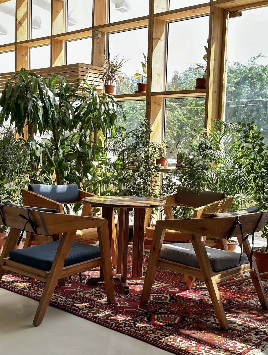 الساحة الخلفية للمقهى اشبة ماتكون بالجلسة داخل حديقة بين الأشجار والنباتات 🌳