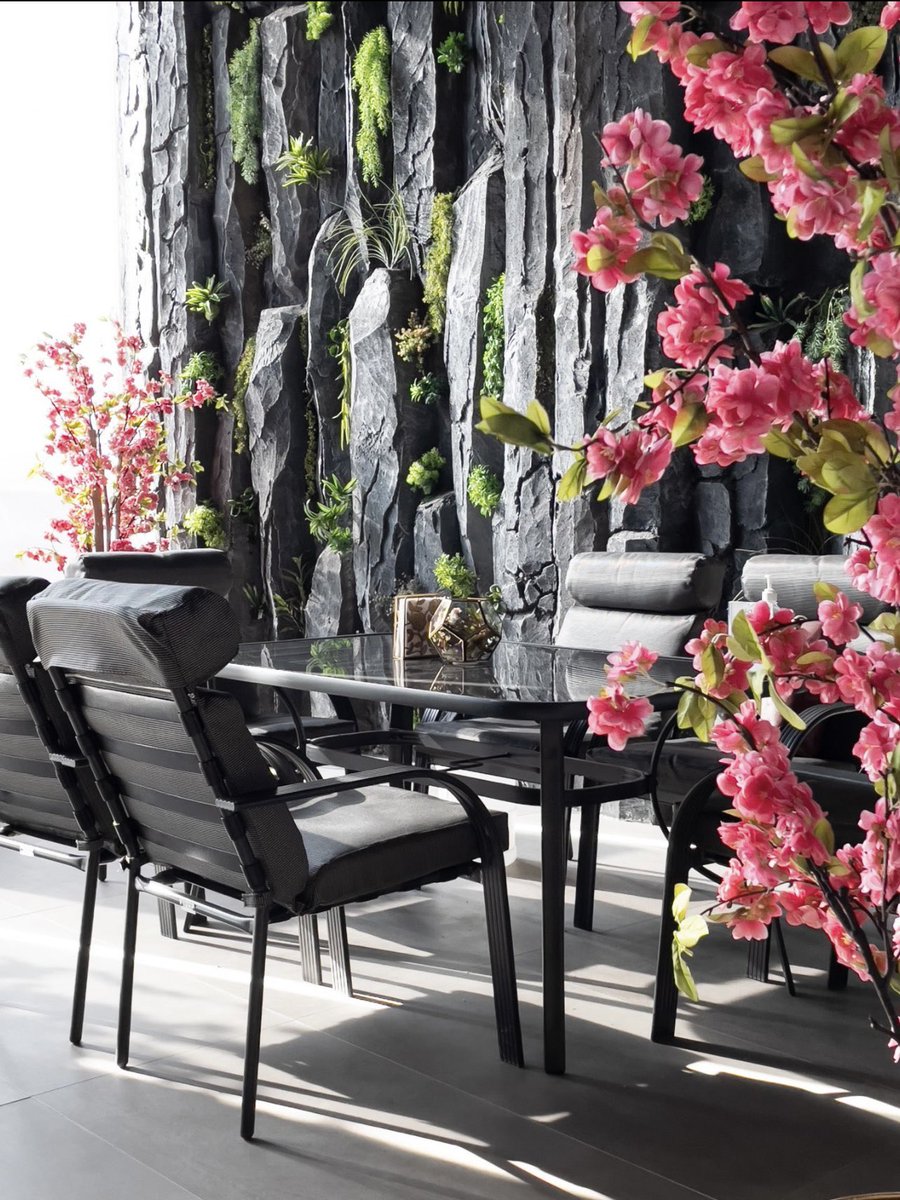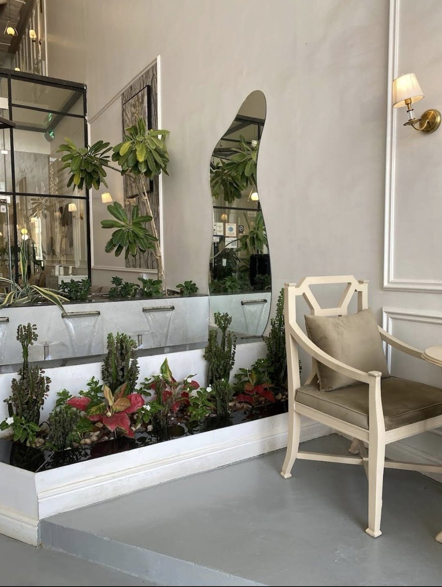 يوجد بارتشن والنباتات تملأ المكان والطاولات فيها شلال 🌊