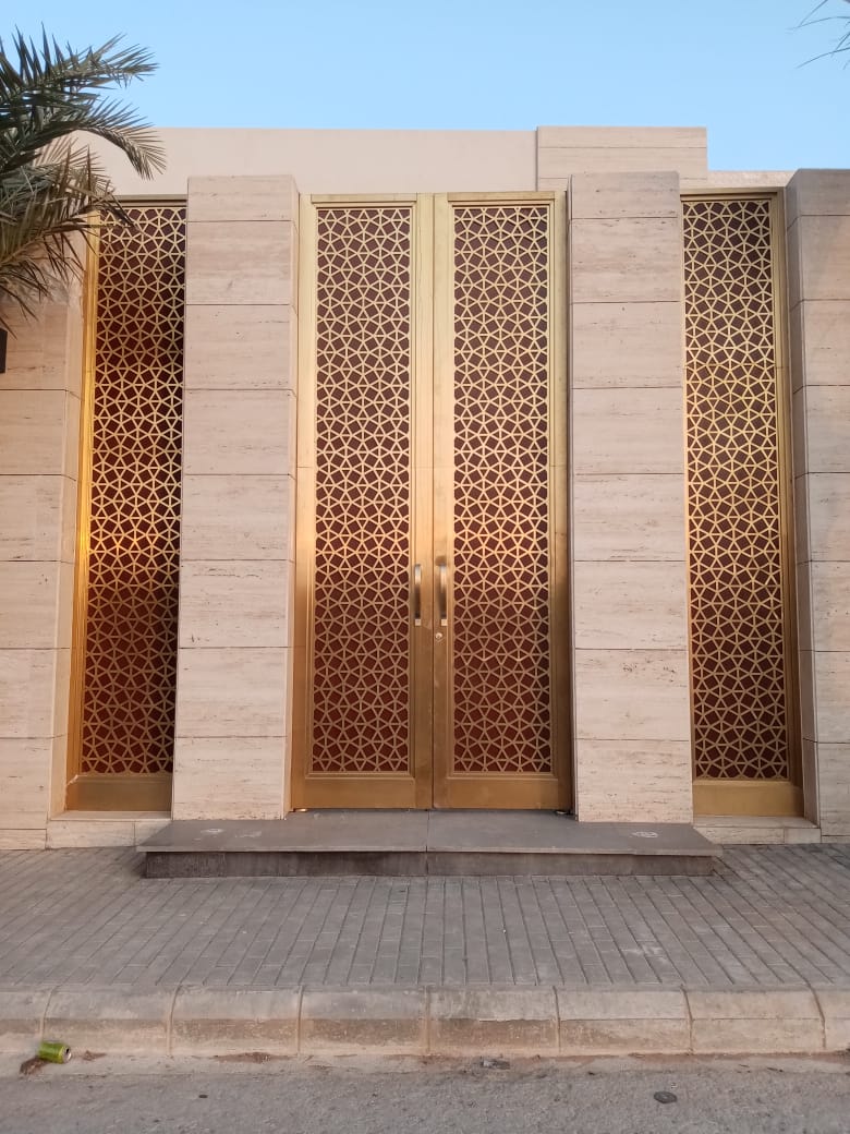 4️⃣ اضافة شرائح الستانلس ستيل 304 مقاوم الصدأ او ديكورات قص الليزر من الألمنيوم او الكلادنج الى الباب تمنح تصميمه المزيد من الحيوية والاناقة