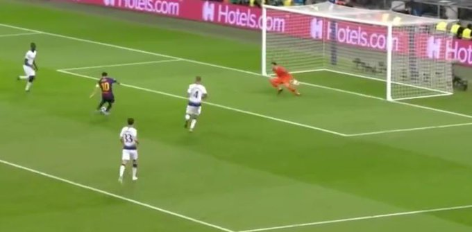 مثال : هذه التسديدة من ليو ميسي أمام توتنهام إحتمالية تسجيلها ( ال xG ) 0.75 ، يعني أنه إذا أعيدت الفرصة 100 مرة فسيتم تسجيل 75 هدف منها
