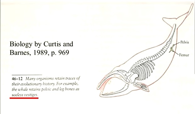 قائلا أنها "بقايا أثرية بلا فائدة, ثم تبعه على وصف هذه العظام أنها باقيا بلا فائدة معظم -ان لم يكن- كل كتب علم الاحياء في الجامعات الغربية! والمعتمدة كذلك في الجامعات العربية