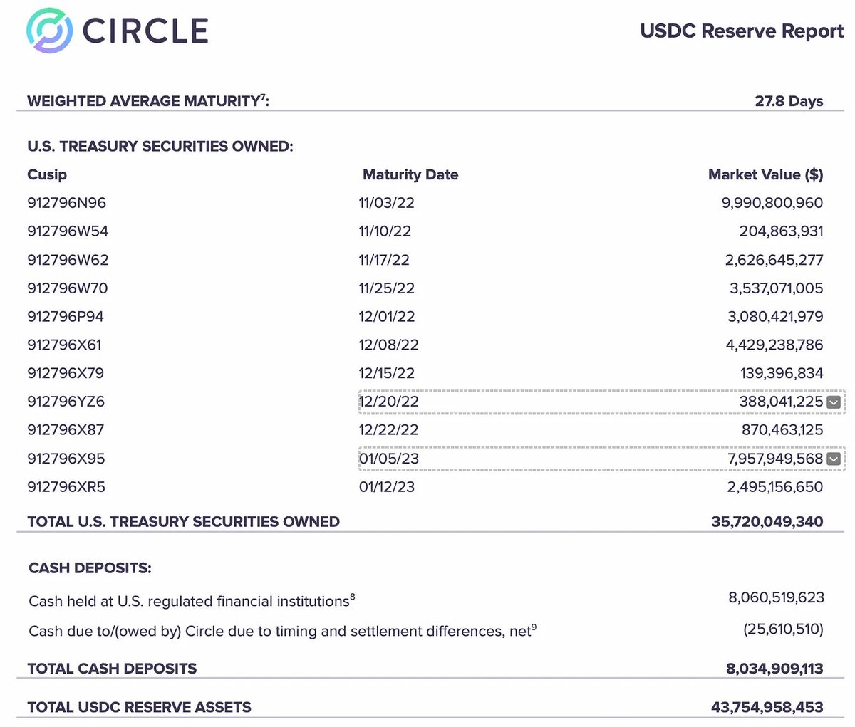 فإن إفصاح Circle يوفر مستوى جيداً من التفاصيل حول الأصول التي تدعم احتياطياتها. لديهم مزيج بسيط نسبيًا من الأصول السائلة والمنخفضة المخاطر التي من السهل تصفيتها في حالة رغبة مالكي عملتهم المستقرة في استرداد دولاراتهم.