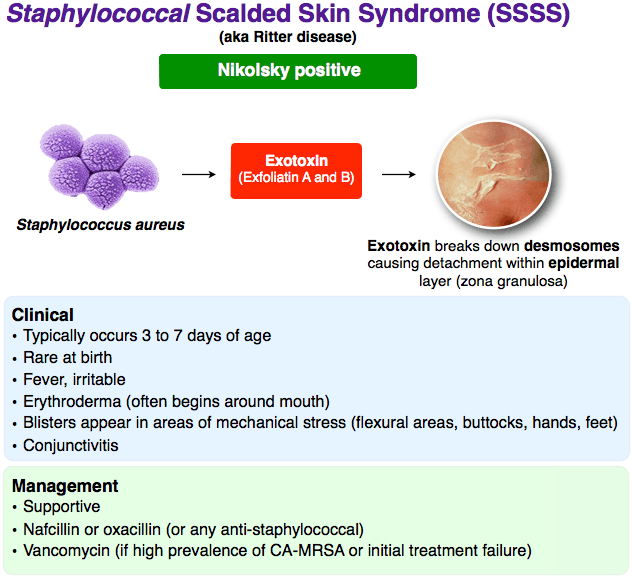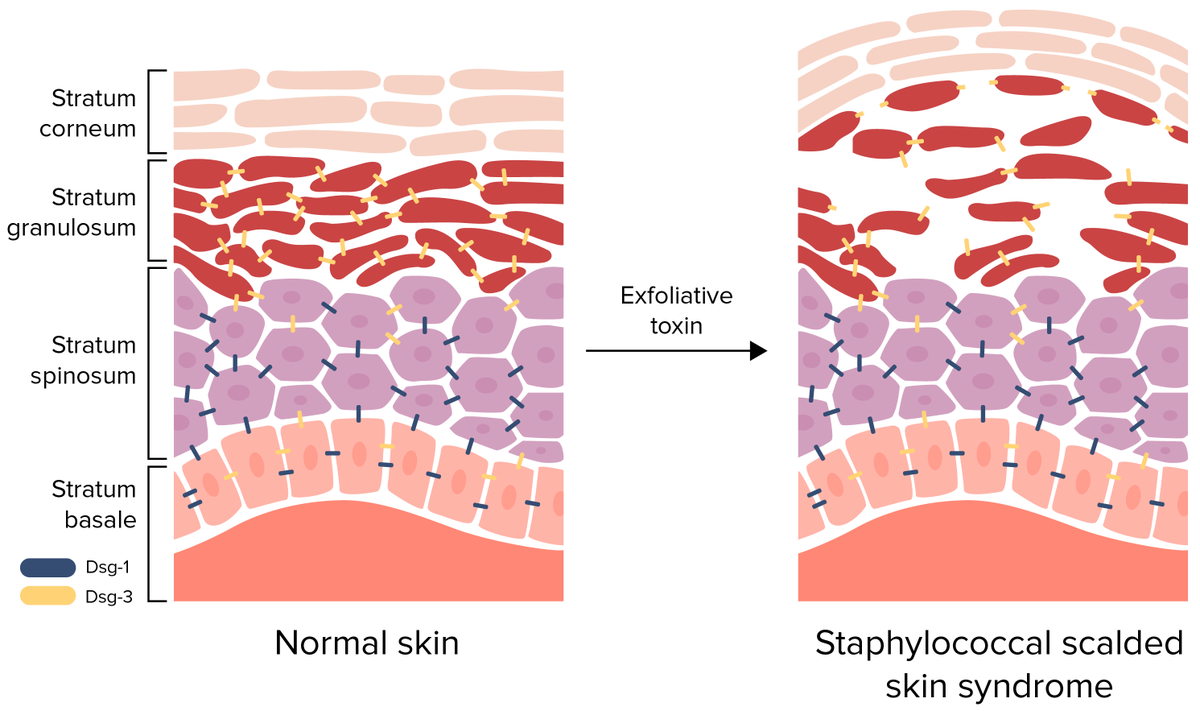 ينتج مرض ريتر عن سلالات من المكورات العنقودية المنتجة للسموم والتي تستهدف مركب ديسموجلين 1 في المنطقة الحبيبية من البشرة ، مما يتسبب في تقشر الجلد.