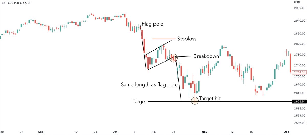 - Breakout point = confirmed candle close below the bottom support of the flag