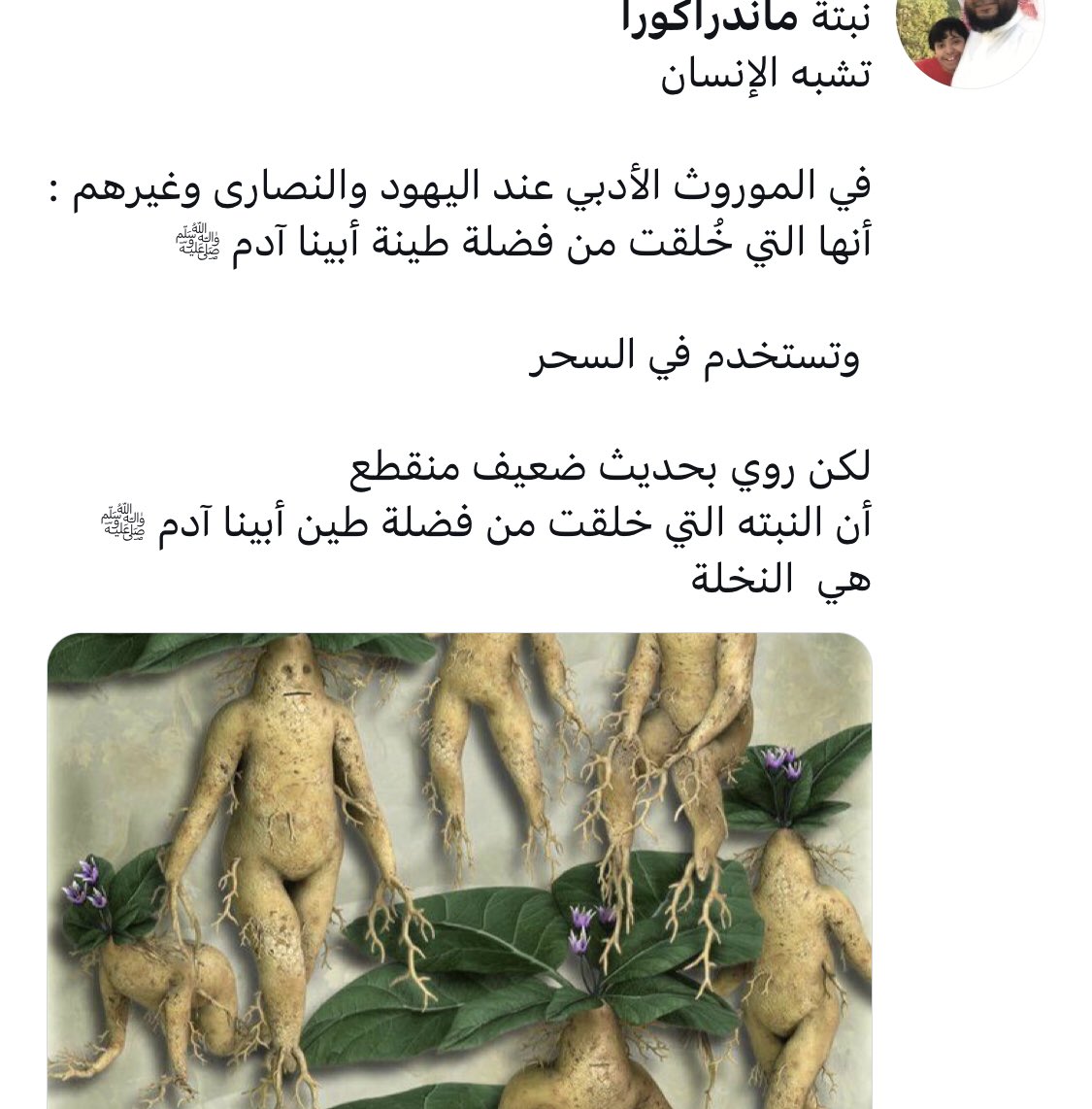 النبات مجرد نبات سام من فصيلة الباذنجانيات، جذوره وتدية متشعّبة لا تشبه البشر نهائياً