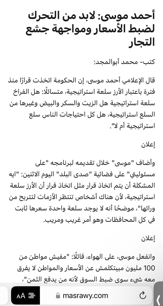 ٤- طالب أحمد موسى وقتها باتخاذ إجراءات استثنائية لكنه لم يذكر مثالاً واحداً عن النسبة التي يمثلها جشع التجار من الأزمة.