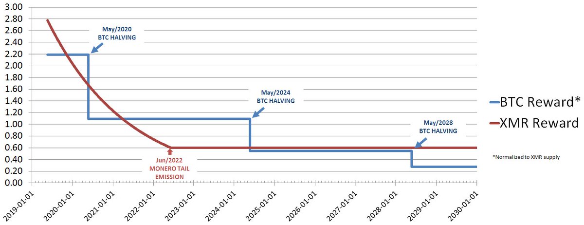 في بلوكتشين #XMR على سبيل المثال عائد البلوك ثابت 0.6 XMR، وهذا يمنحها استدامة اقتصادية مدى الحياة.