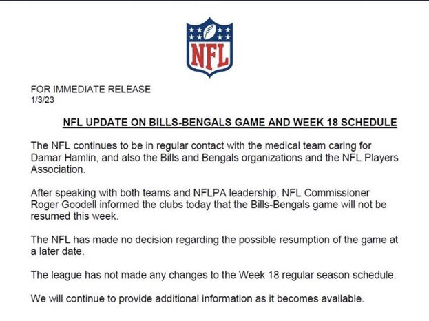 تحديث جديد من فريق البيلز يشير الى انه ورغم ان حالة دمار هاملين لانزال حرجة ولكن الحالة العصبية للاعب لاتزال سليمة