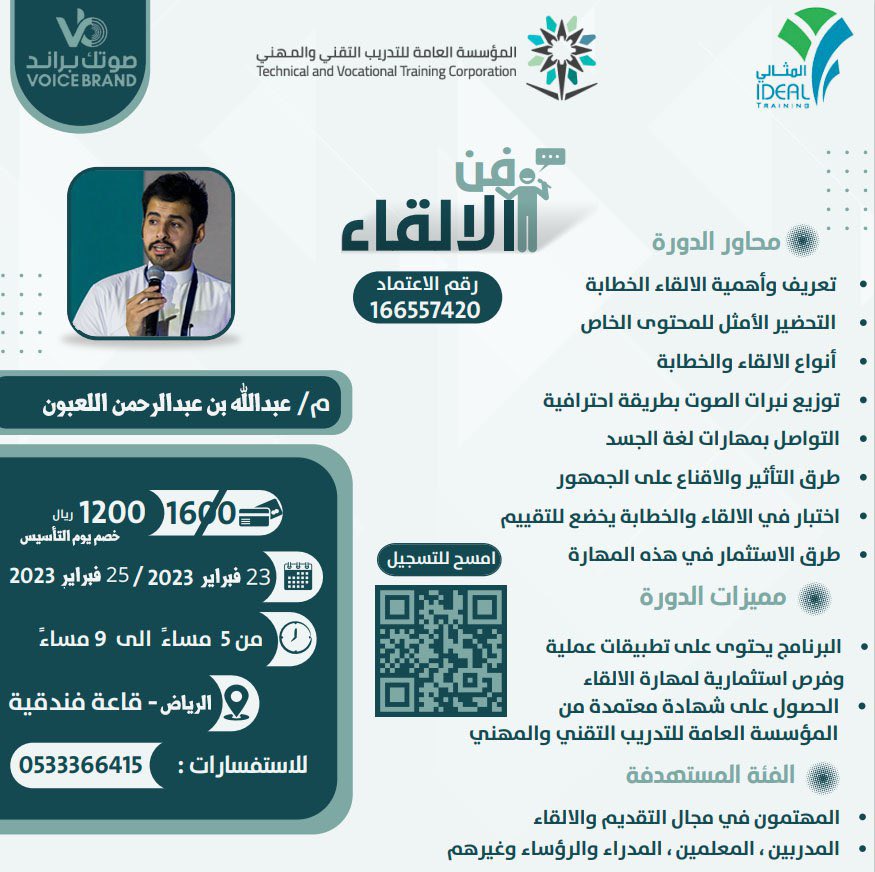 الخوف من التحدث أمام الجمهور أمر شائع، وقد يتفاوت بداية من التوتر الخفيف إلى الخوف الشديد والهلع ولتتمكّن من فن الالقاء والخطابة، أدعوكم للتسجيل في هذه الدورة التدريبية المُعتمدة من معهد @IdealTraining :