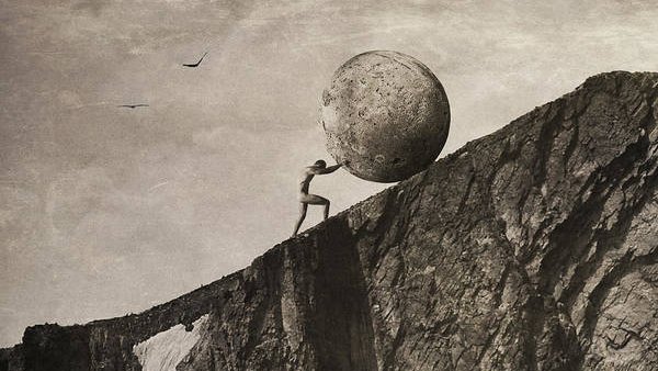 ثانتوس، تبعا لذلك غضبت الالهة الألوميبية وأصدروا عليه حكما بأن يعيش حياة أبدية على أن يقضي سيزيف هذه الأبدية في عمل غير مجدٍ، ألا وهو دحرجة صخرة صعودًا إلى جبل حتى تعود للتدحرج وتنزل من جديد للقاع، مرارا وتكرارا، وبلا نهاية. +