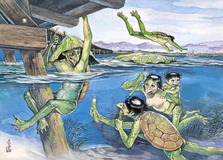 العوالم المائية.رائحتها مثل الأسماك ويتم تصويرها بشكل عام بجسم سلحفاة،ورأس يشبه القرد،وأطراف متقشرة،وشعر طويل يدور حول الجمجمة،وأقدام وأيدي مكشوفة،والجلد الأصفر والأخضر.غالبًا ما يتم تصويرهم بقذيفة سلحفاة مثبتة على ظهورهم.يقول البعض إنهم يستطيعون تغيير لونهم مثل الحرباء.يكرهون