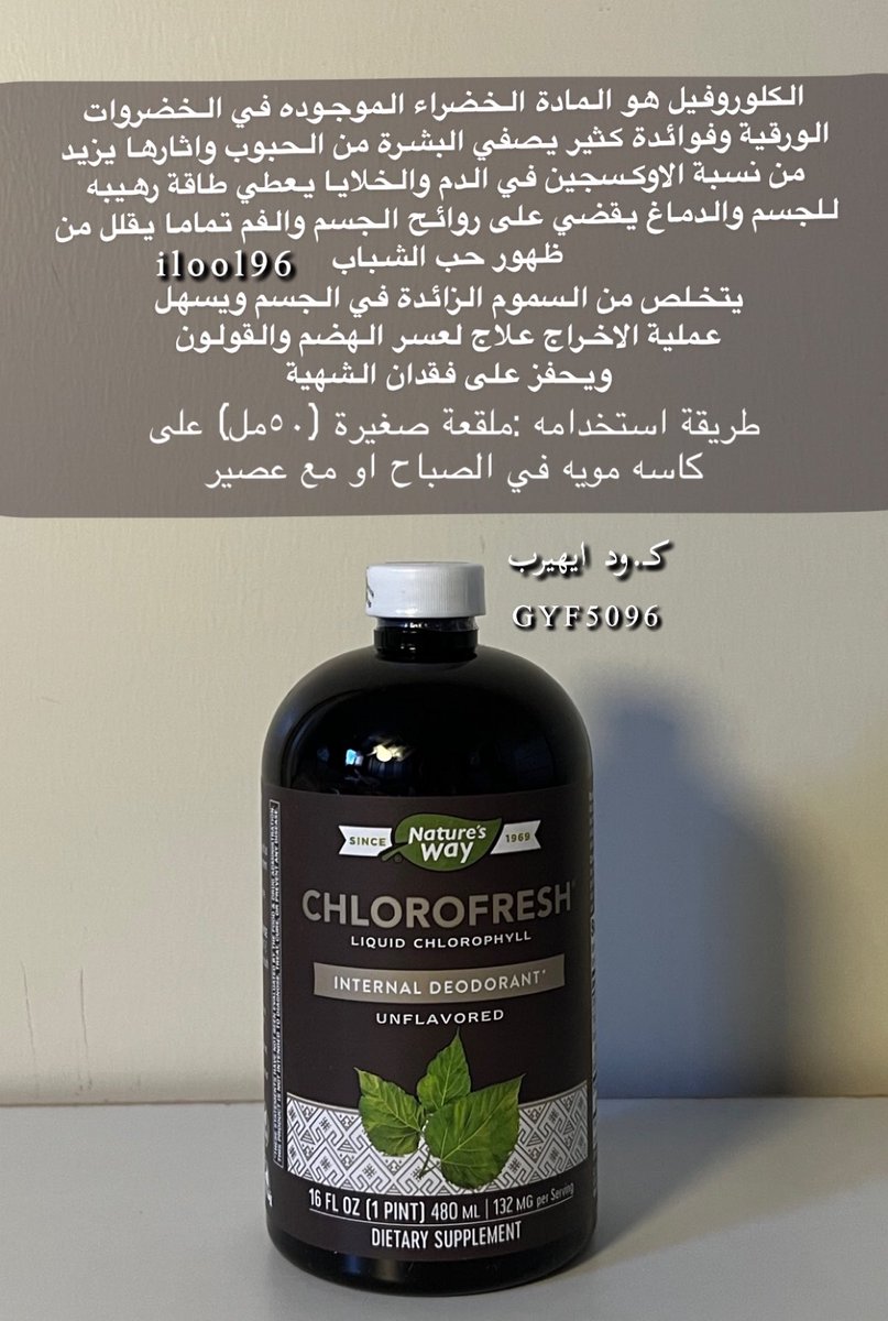 الكلوروفيل السائل اللي يبغا ريحة جسمه وفمه حلوه وشعر واظافر صحيين ياخذه ويدعي لي 🫶🏼