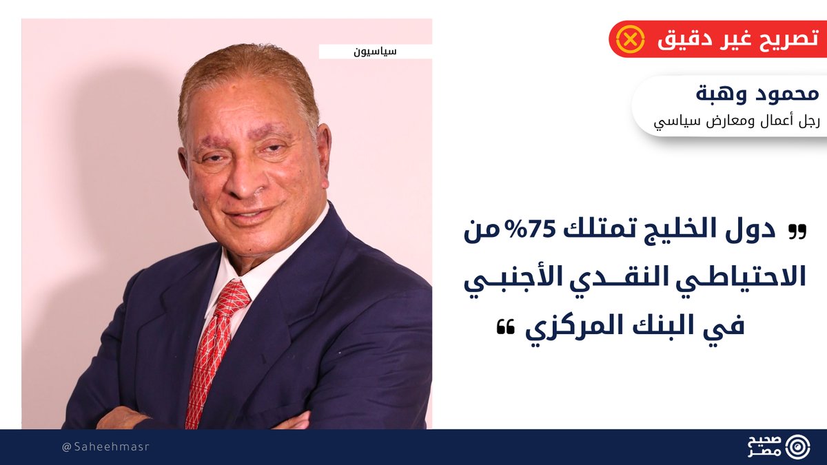 ✅ تصريح محمود وهبة غير دقيق، تُمثل الودائع الخليجية نسبة 82.35% من إجمالي الاحتياطي النقدي الأجنبي المصري، وليس 75% كما يزعم وهبة.