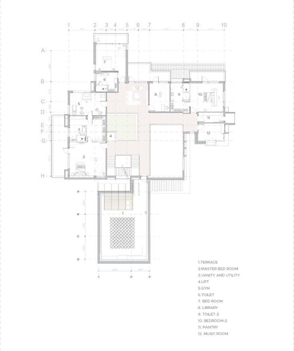 تم تقسيم المنزل إلى منطقتين ؛ يشكل الطابق الأرضي والطابق الأول مناطق عائلية خاصة ، في حين أن منطقة الضيوف عبارة عن جناح مميز يقتصر على الطابق الأرضي بينما يتم توصيله بمساحات عائلية على نفس المستوى.