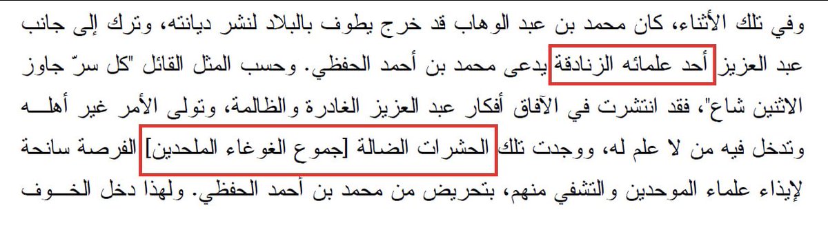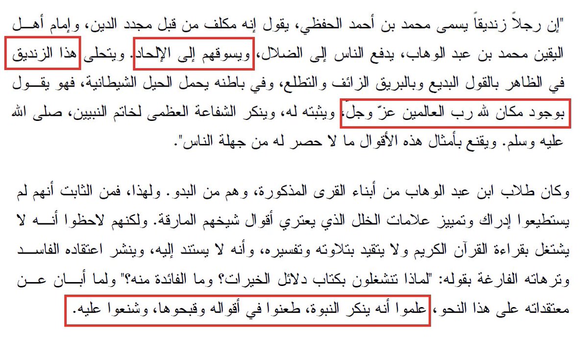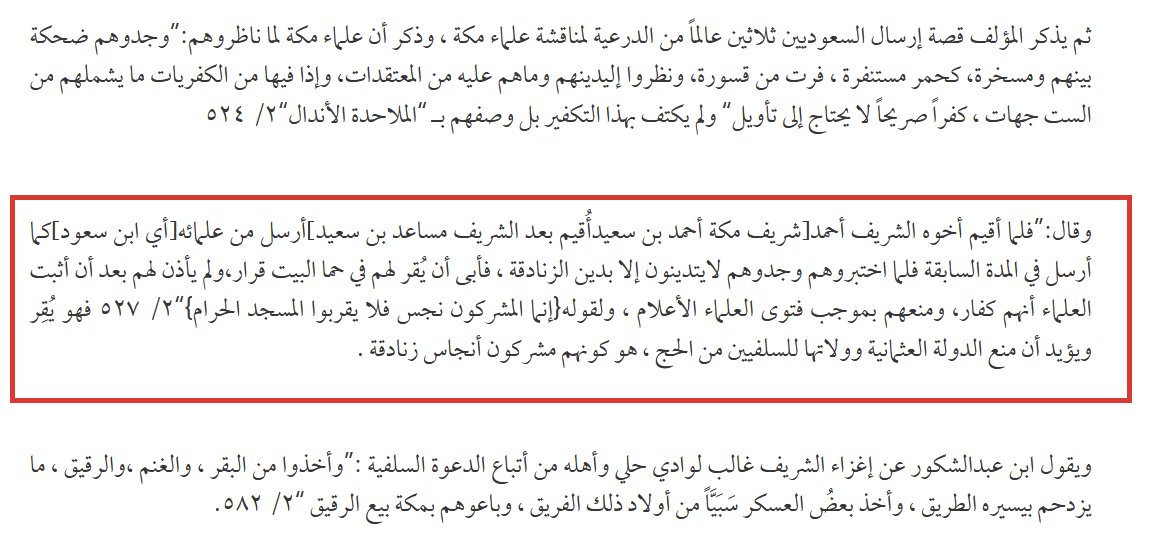 ثم ينقل خطابب التحريض من علماء المشركين إلى الدولة العثمانية وفيه: "أنه لو استولى الوهابية على الحرامين لم يبق في الحجاز مسلم واحد"! على شأن الوهابية ليسوا بمسلمين طبعا!