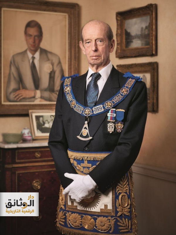 صورة للأمير  إدوارد ، دوق كينت، إبن عم اليزابيث الثانية، ملكة إنكلترا، بلباسه الماسوني الرسمي بصفته الأستاذ الأعظم العاشر للمحفل الإنكليزي الأكبر منذ عام ١٩٦٧حتى تاريخ اليوم