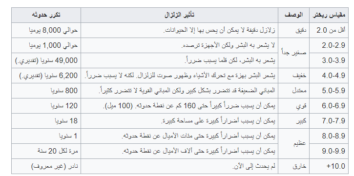 - ازدياد القيمة بدرجة واحدة على المقياس يمثل ازدياد 10 أضعاف في قوة الزلزال. بمعنى آخر، الأرقام على مقياس ريختر تتناسب مع اللوغاريتمات المعروفة (العشر الأساسيات) لأكبر سعة للموجات الزلزالية