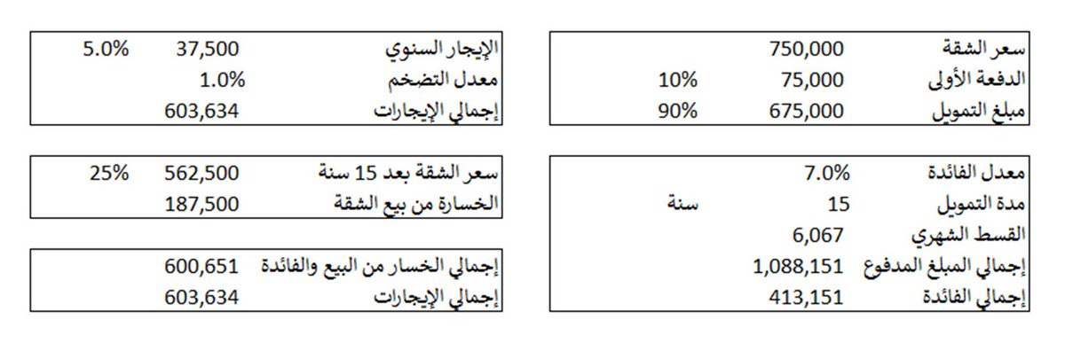 لديك فرصة لشراء شقة بـ750 ألف ريال بتمويل بنكي يصل إلى 15 سنة وبدفعة أولية قدرها 10%. معدل الفائدة هو من 4% إلى 5% ولكن لنفترض 7% هنا وبدون أن يكون مدعوما.