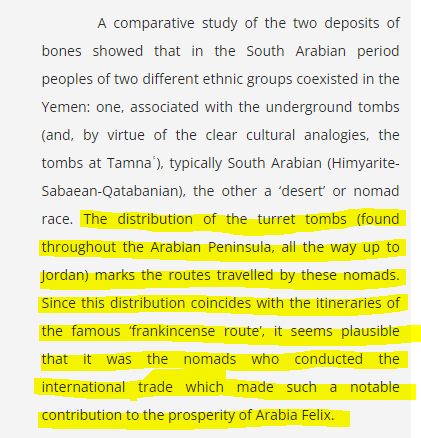 @alk3aam كذلك أشارت الدراسة إلى أن مقابر البادية بهذه الهيئة منتشرة في شبه الجزيرة العربية على طول مسار درب البخور من داخل ما يسمى حديثا بالـ"يمن" إلى الأردن، و هو ما يدلل على أن هؤلاء البدو (كما أسمتهم الدراسة)، و هم في الحقيقة "العرب"، هم من كانوا يمارسوا التجارة ما بين الجنوب و الشمال.