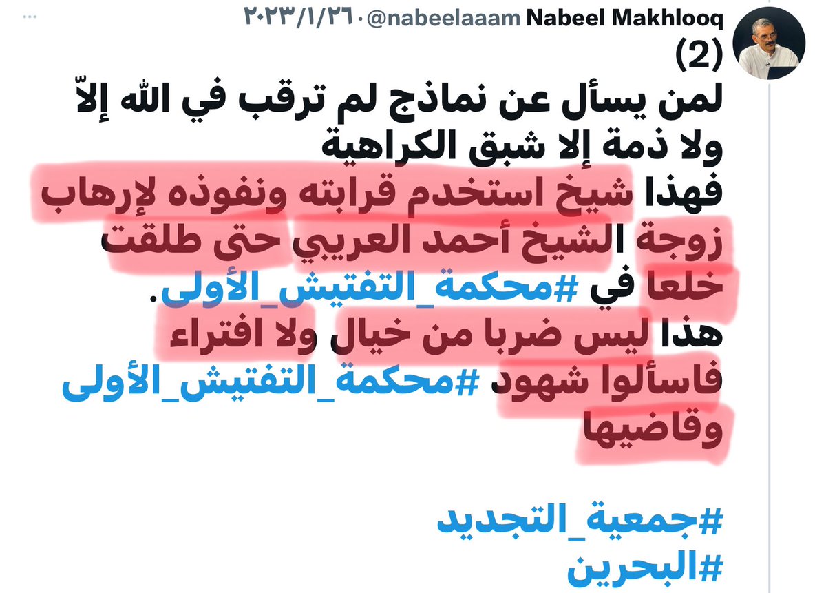 ذكر المدعو ( نبيل المخلوق ) - ضمن تغريدة له كما هو مبين في المرفقات - قصة طلاق "أحد أعضاء الجمعية" اعتماداً على شهادة ( حدسية لا حسية ) منسوبة للزوج لا قيمة لها