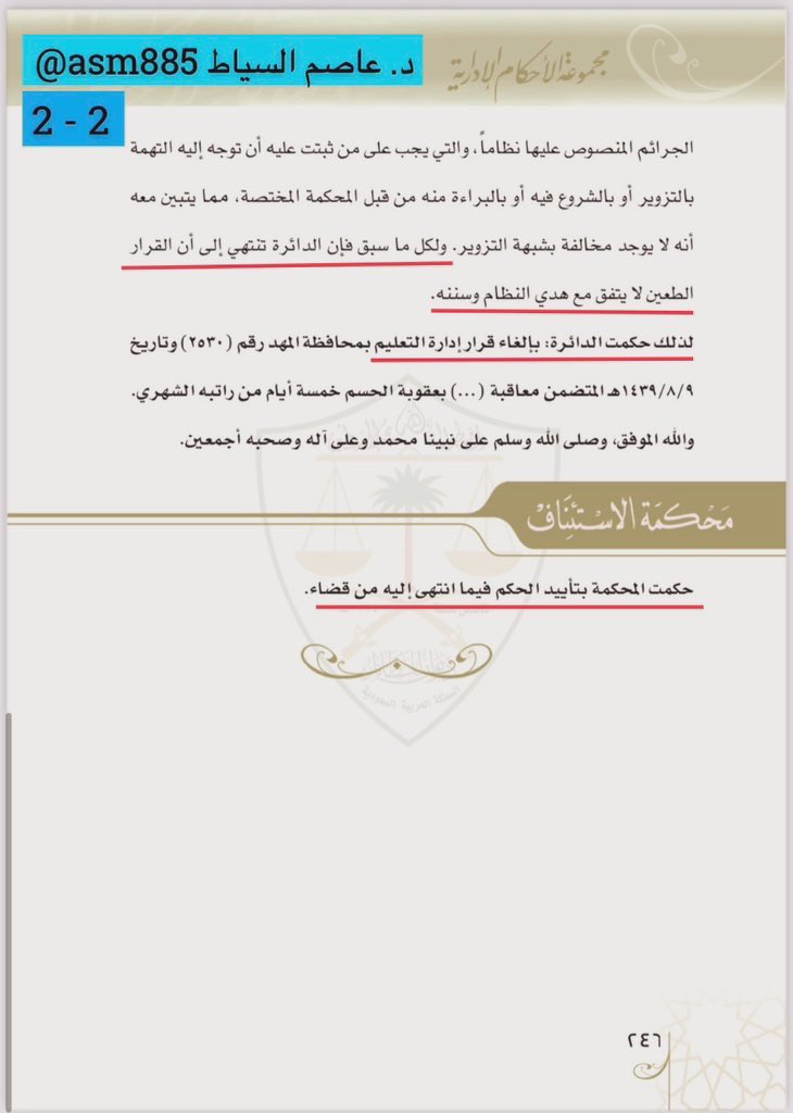 3/ حيث قالت المحكمة الإدارية "كما في الحكم المرفق أعلاه" أن القرار الطعين لم يُنص فيه على سبب محدد، وإنما جاء ذكر السبب في ثنايا القرار بشكل مجمل كما بالتوضيح الوارد في الحكم، وأن هذا الإجمال هو إجمال مخل، الأمر الذي أدى إلى اختلال ركن السبب في القرار الإداري، مما يسوّغ إلغاءه.