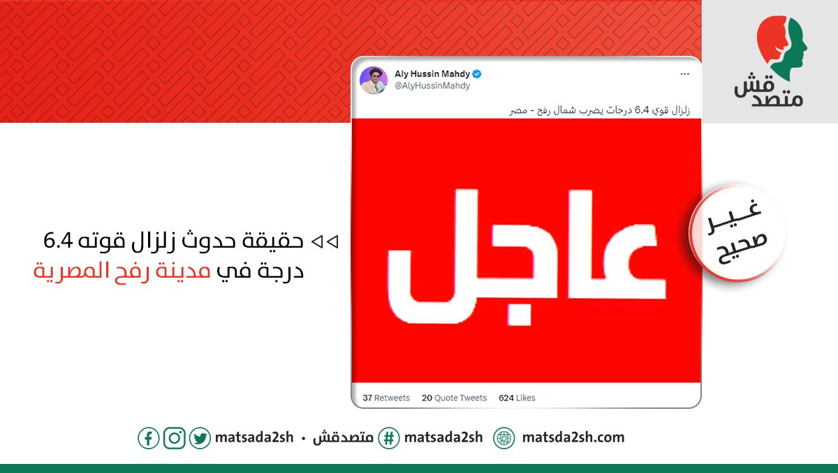 فلم يحدث زلزال بمدينة رفح نفسها لكن مركز الزلزال (...) يبعد عن محطة رصد الزلازل المصرية الموجودة في مدينة رفح مسافة 552 كيلو متر". ✅✅