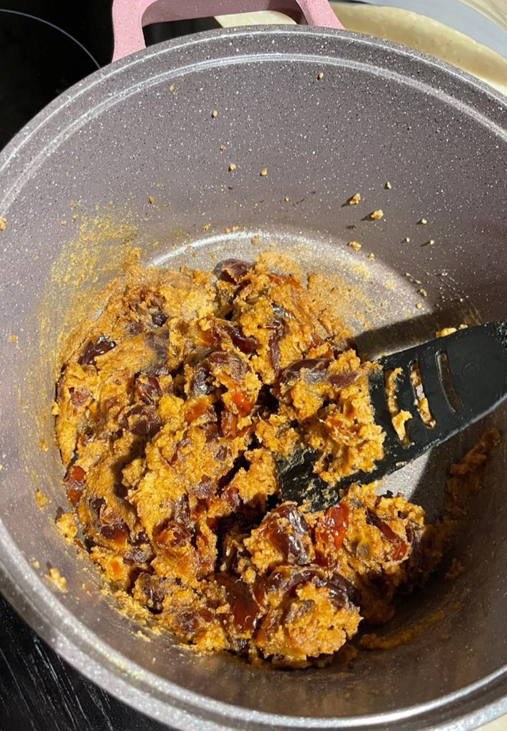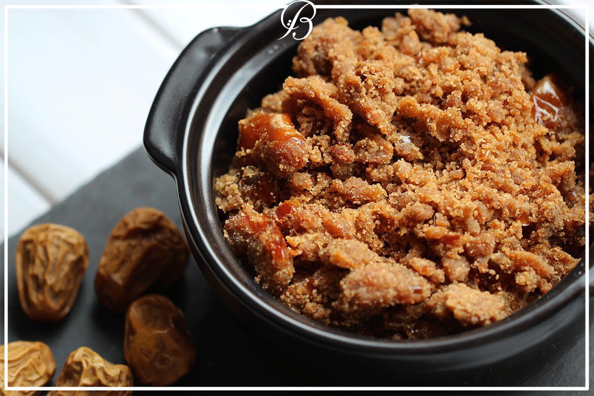 يرشون التمر بالسمسم او حبة البركة او يغمسونه بطحينة السمسم السائلة ( وهذا بروتين عالي جداً طبيعي )