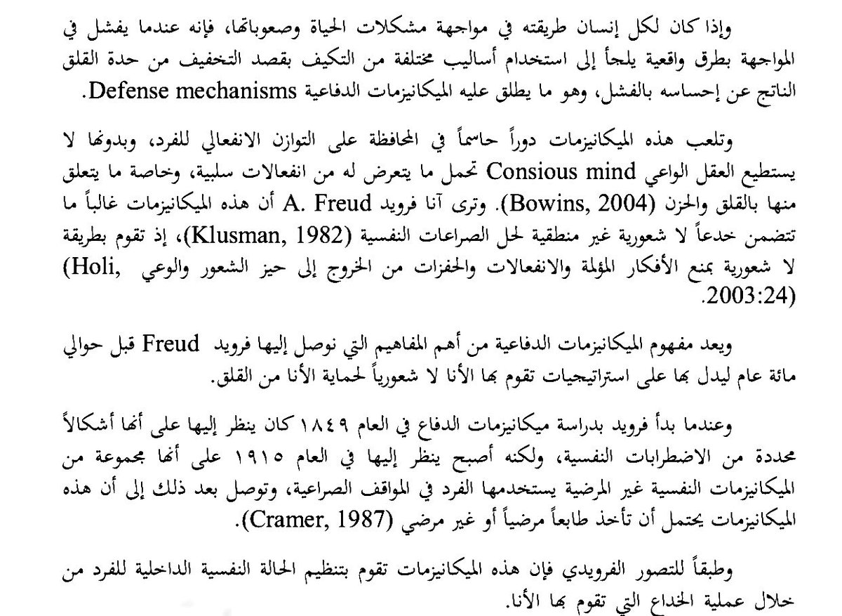 ٦/ النكوص : العودة سلوكياً الى مرحلة عُمريّة مبكّرة و تكون السلوكيات غير مناسبة للمرحلة التي يعيشها الشخص .. مثلاً طفل يشعر بالخوف من قدوم مولود جديد(أخ جديد) الطفل سيخاف، و يقلق من فقدان اهتمام الأم فيتمثّل نكوصه في مصّ إصبعه أو التبوّل اللاإرادي أو البكاء .