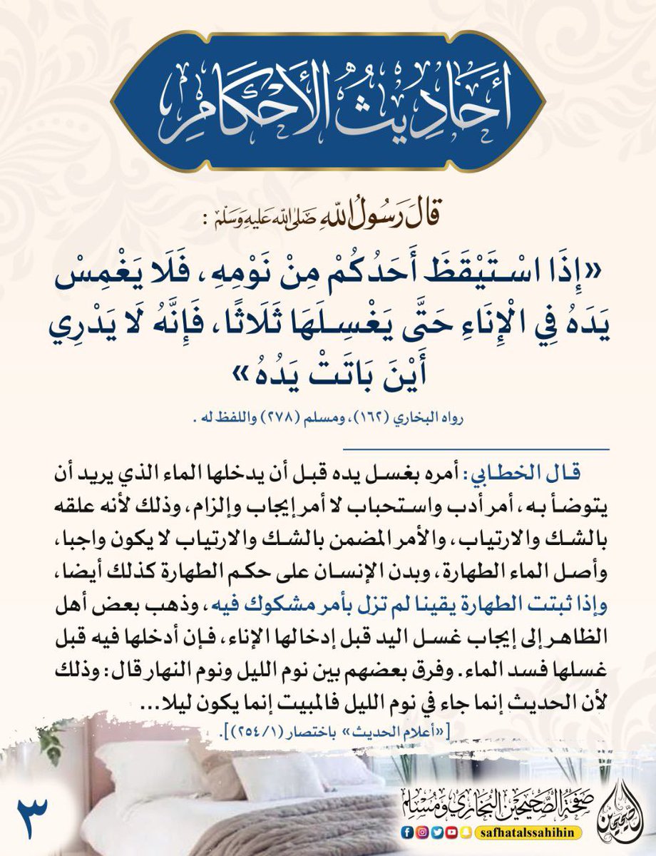 قال رسول الله ﷺ: « إذا استيقظ أحدكم من نومه فلا يغمس يده في الإناء حتى يغسلها ثلاثا، فإنه لا يدري أين باتت يده»