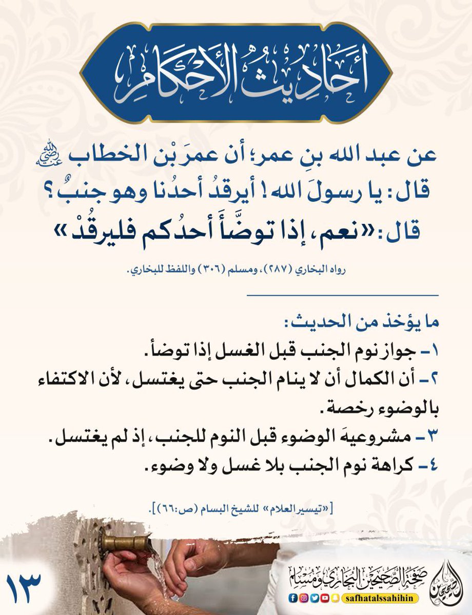 عن عمر بن الخطاب رضي الله عنه قال: يا رسول الله! أيرقد أحدنا وهو جنب؟ قال: "نعم، إذا توضأ أحدكم فليرقد"