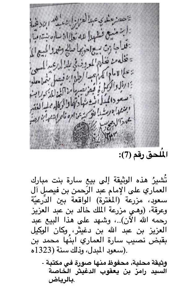 وثيقة تاريخية لـ شراء الإمام عبدالرحمن الفيصل "والد الملك المؤسس عبدالعزيز " لمزرعة المغترة الواقعة بين الدرعية و عرقة وذلك عام 1323هـ