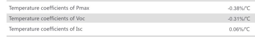 فمثلا قيمة معامل الحرارة الخاص بالقدرة (Pmax) هي - 0.38%/C كما هو مبين بالصورة ، أي أنه في حال زيادة درجة حرارة واحدة فإن القدرة ستقل بنسبة 0.40 % ، و ينطبق ذلك على الجهد والتيار أيضا بنسب مختلفة كما هو مبين بالصورة أدناه .