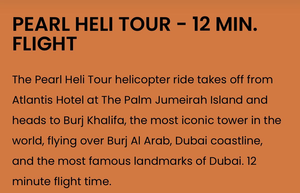 جولة بالهليكوبتر مدة 12 دقيقه وتستوعب إلى ستة ركاب وتبدأ اسعار الجولات من 681 درهم