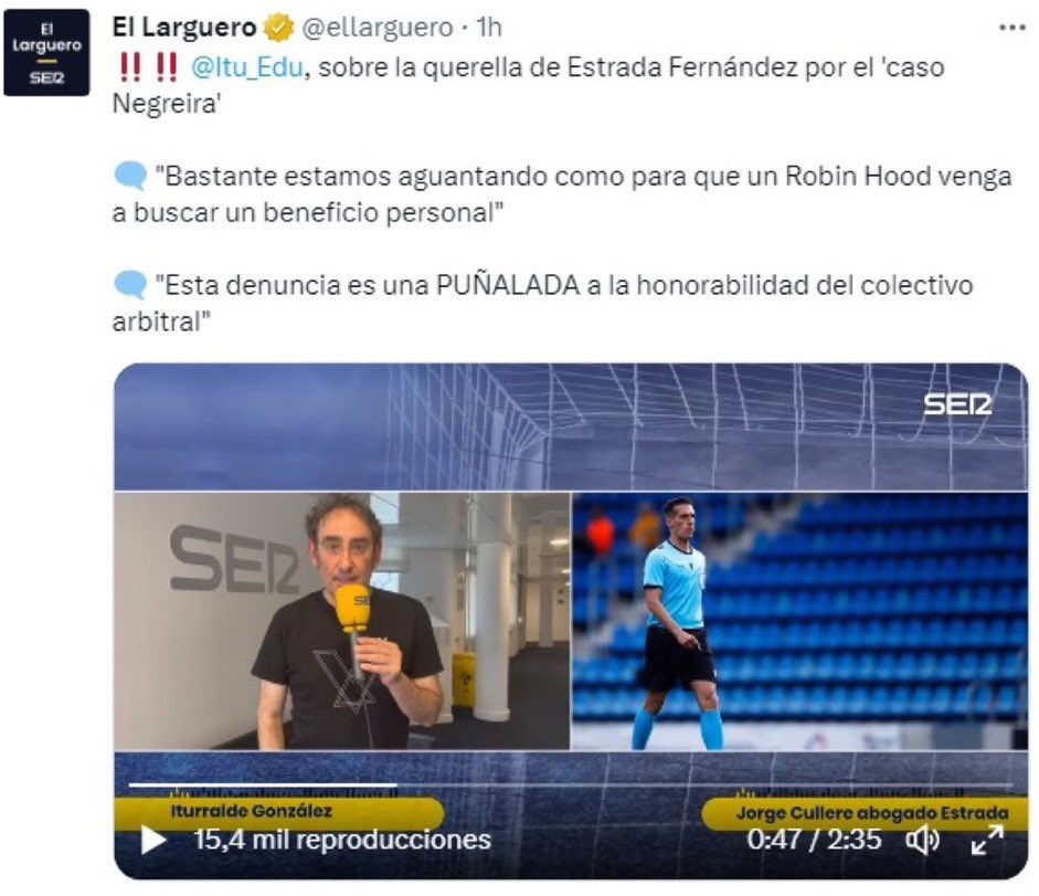بيريز بورول (حكم سابق) : لا أعلم إن كان أحد سيستطيع إيضاح ما هي النصائح التي قدمها نيغريرا مقابل 7 مليون € ؟ من أجل ماذا ؟ ليخبرهم أن يهددوا الحكم إذا مسك البطاقة بيده ؟!