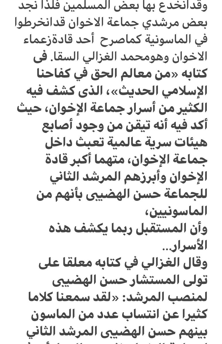 وقال الغزالي معلقا على تولى الهضيبى لمنصب المرشد"لقدسمعنا كلاماكثيرا عن انتساب عدد من الماسون بينهم حسن الهضيبى المرشد الثاني لجماعة الإخوان نفسه ولكن لا أعرف بالضبط كيف استطاعت هذه الهيئات الكافرة بالإسلام أن تخنق جماعة كبيرة على هذاالنحووربما يكشف المستقبل أسرار هذه المأساة»