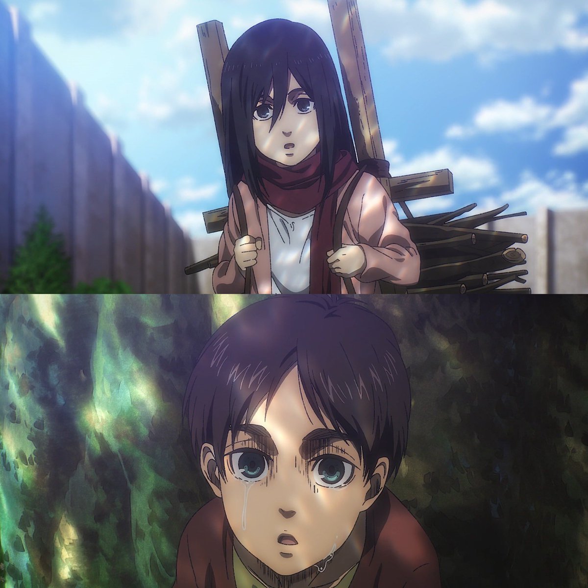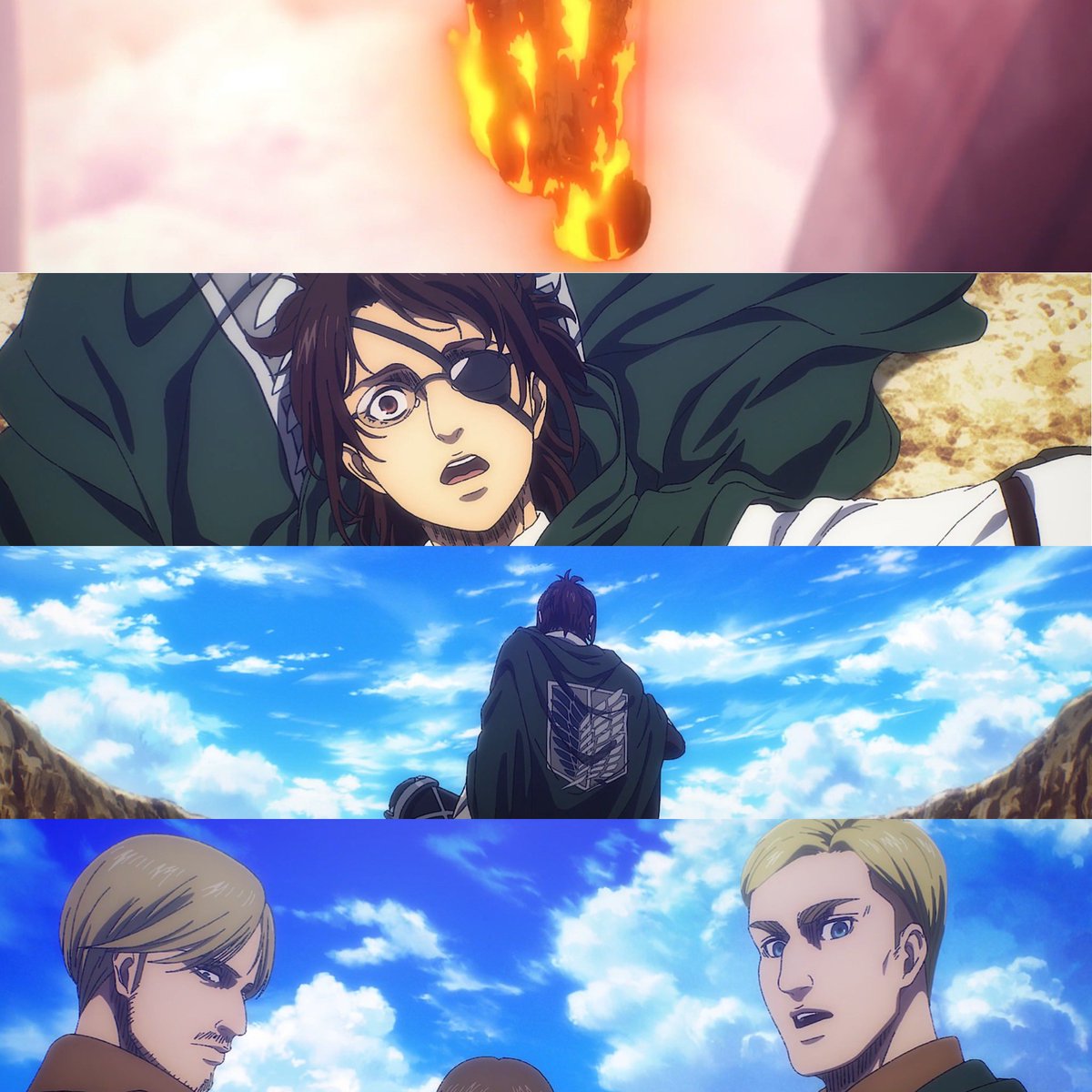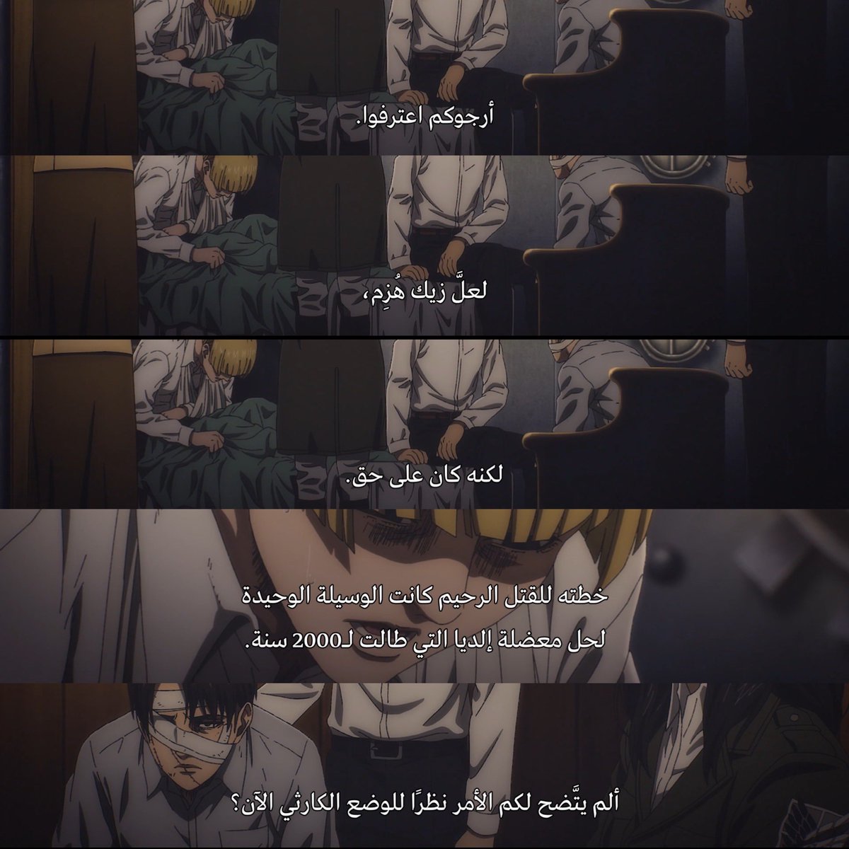 ”ما يوجد فعلًا خارج الأسوار مختلفٌ تمامًا عن العالم الذي حلمتُ به. لم يكن كالعالم الذي رأيته في كتاب أرمين. حينما علمت بأن البشرية تعيش خارج الأسوار، خاب أملي كثيرًا، أنا من أراد ذلك. أردتُ محوه كله“.