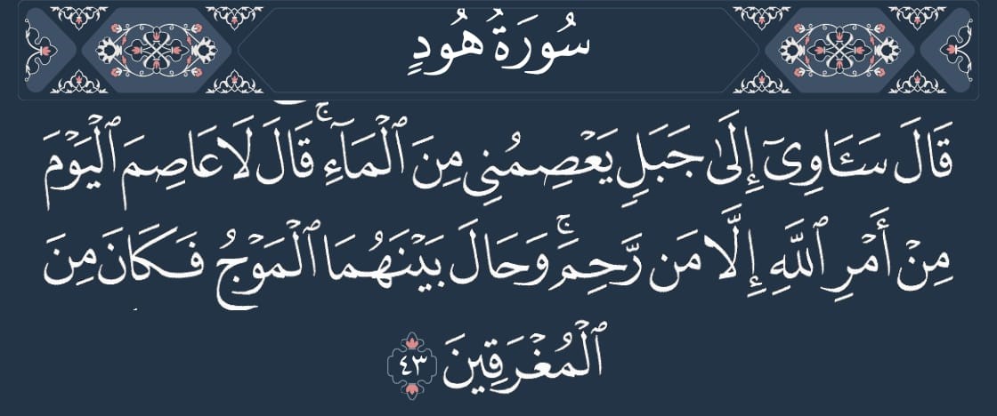 * كان رد الابن موضحا، عن مدى تردده في تصديق كلام ربه (سآوي إلى جبلٍ يعصمني من الماء) فقد تعلّق بالمادة باعتبار عظمة الجبل وارتفاعه، فكان الجواب (لا عاصم اليوم من أمر الله إلا من رحم) ولا مفر منه إلا إليه سبحانه.