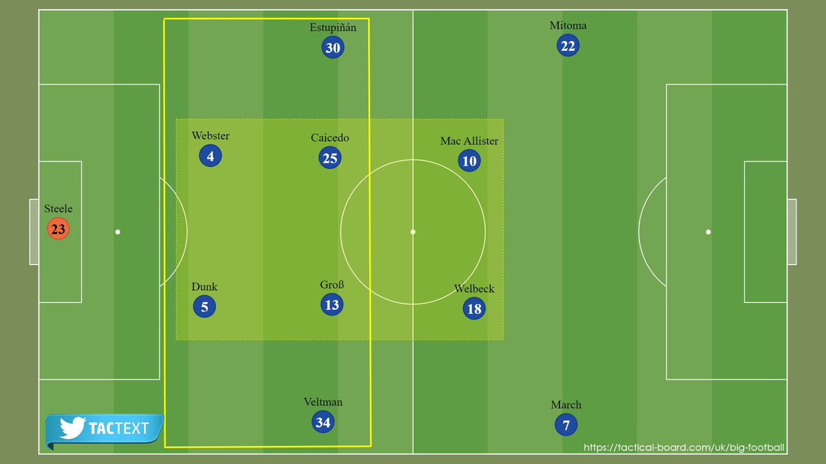 مع الاحتفاظ بفكرة مصائد الضغط في وسط الملعب؛ يسعى لاعبوا برايتون للتقدم أكثر والضغط مع إعادة الكرة للخلف لإجبار الخصم على التشتيت أو الخطأ في التمرير