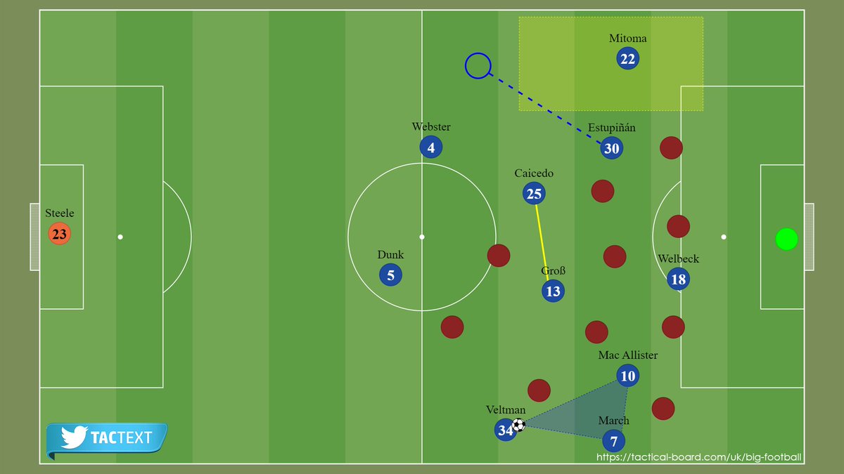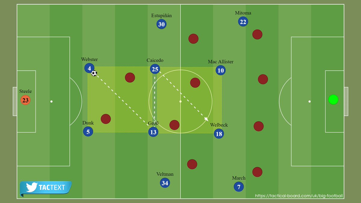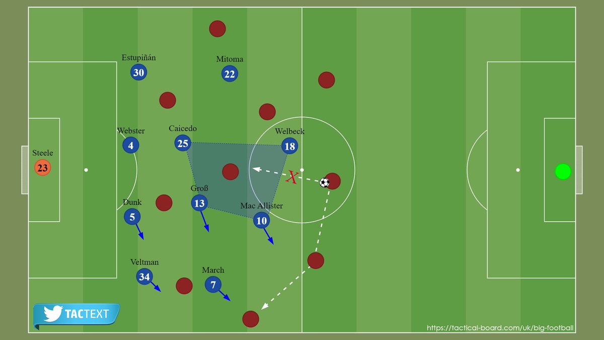 أما لو اختار الخصم الضغط رجل لرجل؛ تُخلق مساحة كبيرة في خط دفاعه مع نزول مهاجم برايتون ولاعب الوسط المتقدم بين الخطوط.