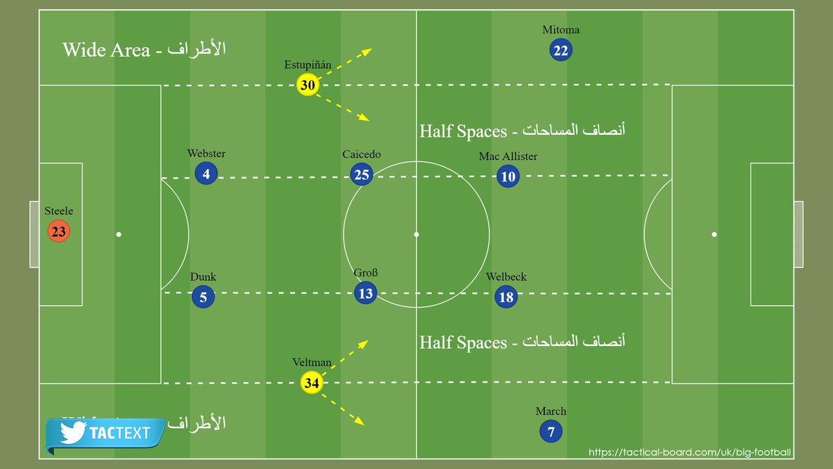 هجومياً؛ يستهدف برايتون إشغال كافة الممرات الأفقية للملعب [الأطراف - أنصاف المساحات - العمق].