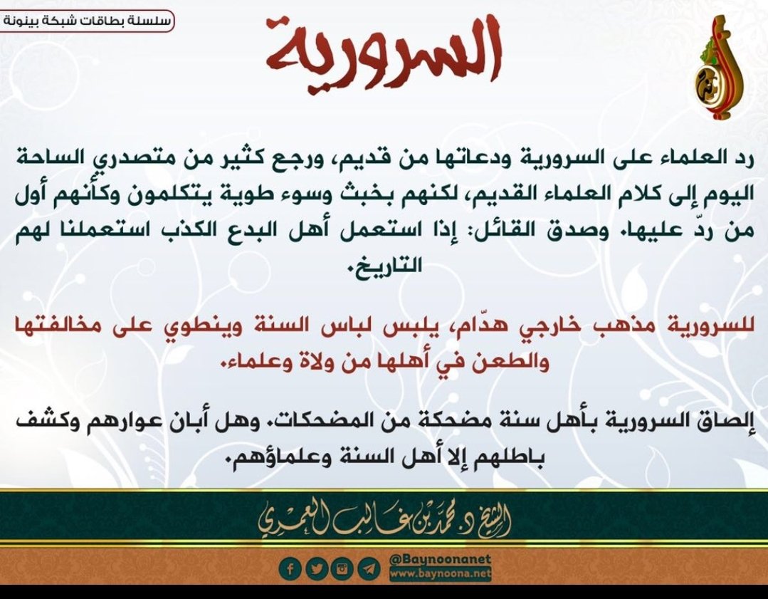 📌أطلق اسم «#السرورية» على هذه الجماعة معارضوها من أهل السنة ومن الإخوان المسلمين