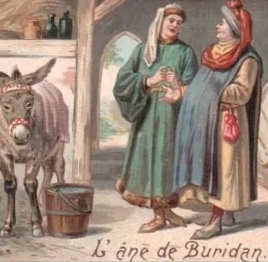 لأنه كان محتار هل يقضي اولاً على الجوع او يروي عطشه قبل كل شيء . .. طبعاً الحيرة سببها ان الحمار بهذه اللحظة بالتحديد كان امام خيارين متشابهين ومتساويين تماماً بالأهمية والضرورة له . .. فجوعه كان في هذه اللحظه مساوي لعطشه تماماً بالاهمية والأولوية .